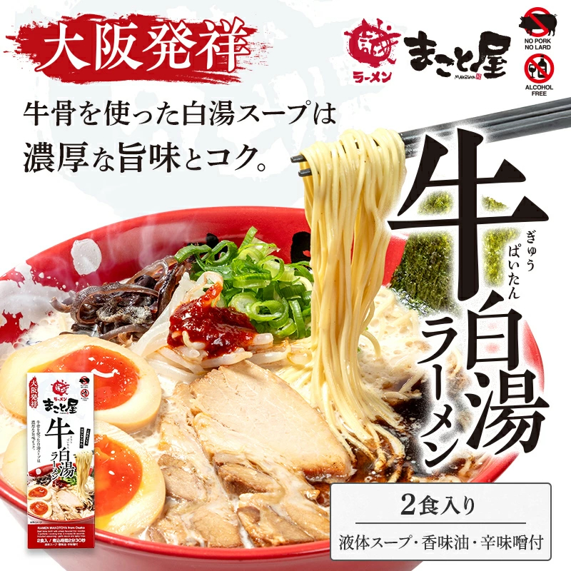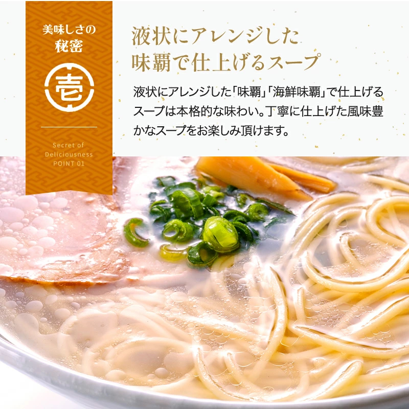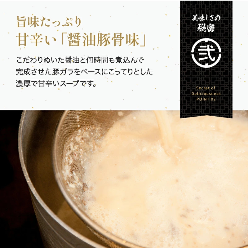 スープは、こってりとした濃厚で甘辛い醤油豚骨味と三種の魚粉末入りの魚介醤油味の2種類があります。(魚介醤油味のパッケージはこちらをご覧ください)