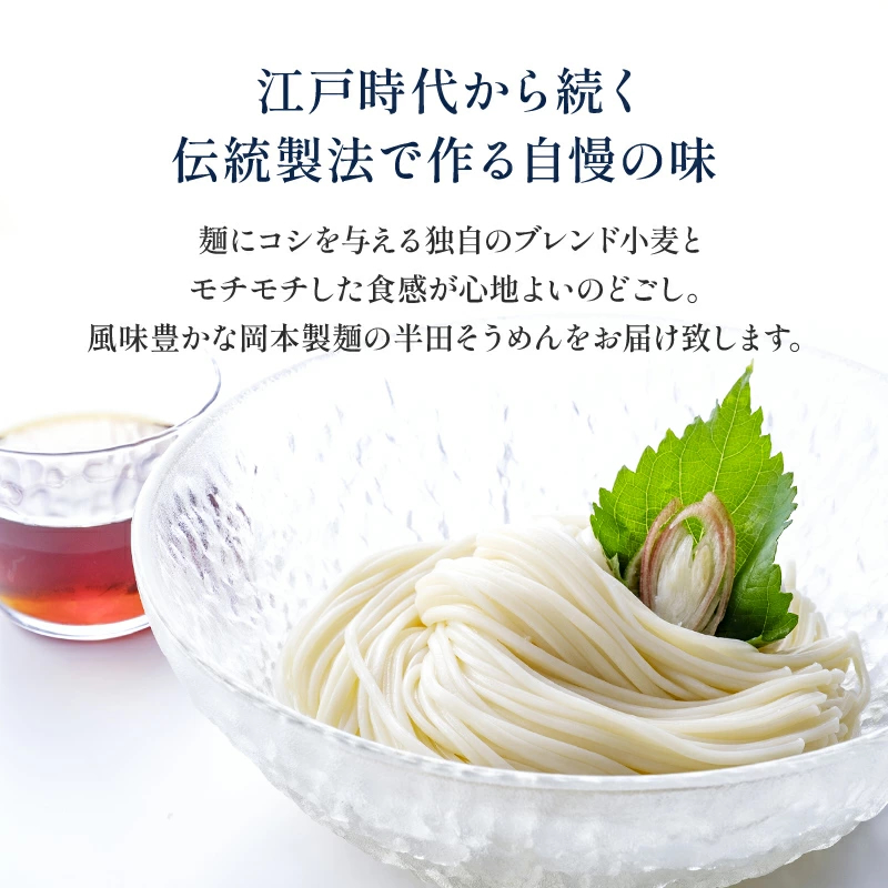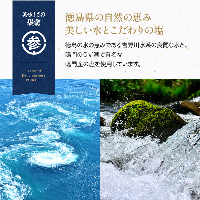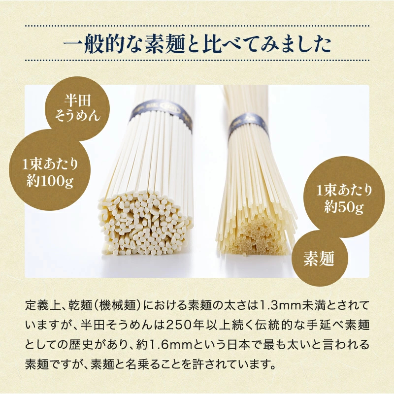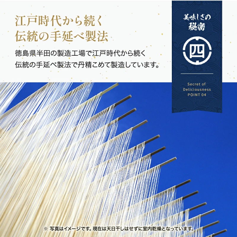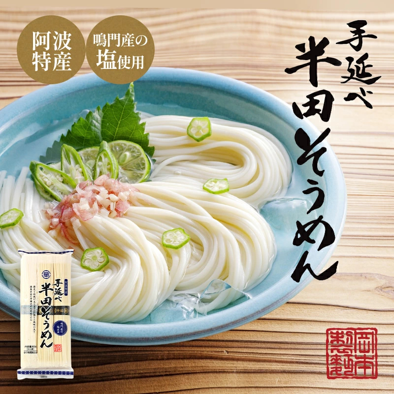 手延べ半田そうめんは、江戸時代中期に現在の奈良県三輪地方から淡路・鳴門をへて伝えられたと言われています。徳島県を流れる吉野川水系の良質な水と、うず潮で有名な鳴門市産の塩を使って半田地方で江戸時代から続く伝統の手延べ製法で作りました。